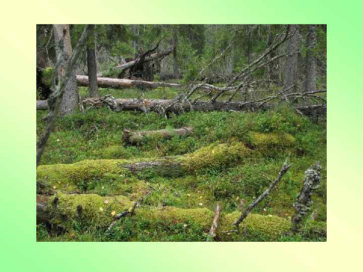 Малонарушенный лес • Развивающийся без катастрофических воздействий человека (рубок, расчисток, воздействия химических средств ухода, промышленного загрязнения и т. д. ); • Смена поколений деревьев происходит постепенно естественным путем в результате случайных нарушений древесного полога, связанных с гибелью части старого древостоя в результате достижения деревьями предельного биологического возраста, воздействия болезней или вредителей, экстремальных климатических явлений или пожаров.