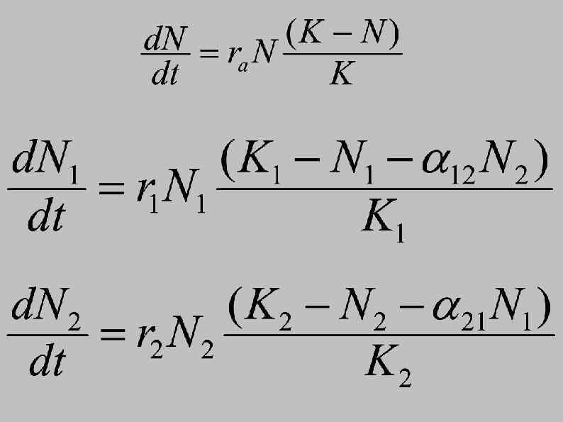 Классическая модель конкуренции Лотки-Вольтерры: Логика уравнений Экспоненциальный рост численности первого вида – экспоненциальное уравнение описывает рост при полном отсутствии конкуренции (популяция ничем не лимитирована) Логистический рост численности первого вида – логистическое уравнение описывает рост при наличии внутривидовой конкуренции. Это происходит в силу наличия «замедляющего» члена (K-N)/K; с ростом N величина (K-N)/K уменьшается и скорость роста замедляется. Рост численности первого вида при наличии второго вида – это уравнение описывает рост как с учетом внутривидовой конкуренции, так и с учетом межвидовой конкуренции Коэффициент конкуренции α 12 показывает, во сколько раз одна особь 2 -го вида потребляет больше ресурсов (или занимает больше пространства), чем одна особь 1 -го вида. Т. е. это коэффициент воздействия 2 -го вида на 1 -й вид.