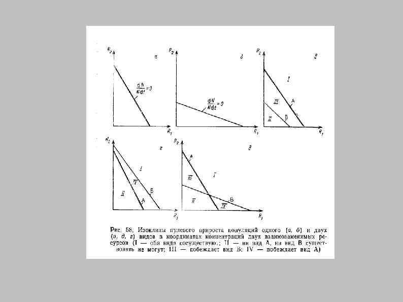 Побеждает A Побеждает B Выживает A Выживает B R A R 1 B R 2 A Изоклины пересекаются Изоклины не пересекаются R 2 Конкуренция двух видов (А и В) за два ресурса (R 1 и R 2) R 2 B A B R 1