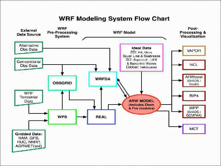 Общая структура прогностической системы WRF Система WRF состоит из следующих основных блоков: 1. предварительной обработки (WRF Preprocessing System, WPS), 2. инициализации (WRFDA), 3. модели WRF (динамических модулей ARW или NMM и параметризаций) и 4. системы подготовки и вывода модельной продукции. Для модели ARW существует дополнительный блок трехмерного вариационного усвоения наблюдений.