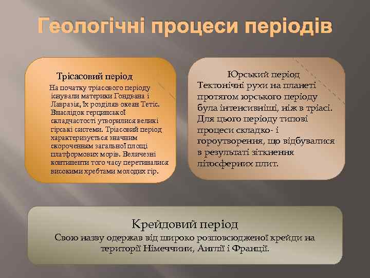 Геологічні процеси періодів Трісасовий період На початку тріасового періоду існували материки Гондвана і Лавразія, їх розділяв океан Тетіс. Внаслідок герцинської складчастості утворилися великі гірські системи. Тріасовий період характеризується значним скороченням загальної площі платформових морів. Величезні континенти того часу перетиналися високими хребтами молодих гір. Юрський період Тектонічні рухи на планеті протягом юрського періоду була інтенсивніші, ніж в тріасі. Для цього періоду типові процеси складко- і гороутворення, що відбувалися в результаті зіткнення літосферних плит. Крейдовий період Свою назву одержав від широко розповсюдженої крейди на території Німеччини, Англії і Франції.