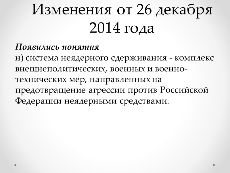 Изменения от 26 декабря 2014 года Появились понятия н) система неядерного сдерживания - комплекс внешнеполитических, военных и военно-технических мер, направленных на предотвращение агрессии против Российской Федерации неядерными средствами.