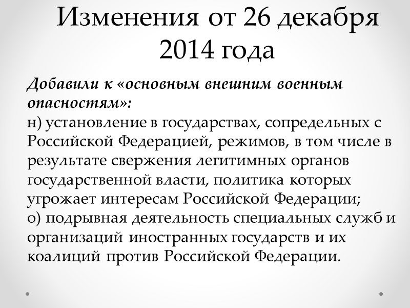 Изменения от 26 декабря 2014 года Добавили к «основным внешним военным опасностям»: н) установление в государствах, сопредельных с Российской Федерацией, режимов, в том числе в результате свержения легитимных органов государственной власти, политика которых угрожает интересам Российской Федерации; о) подрывная деятельность специальных служб и организаций иностранных государств и их коалиций против Российской Федерации.
