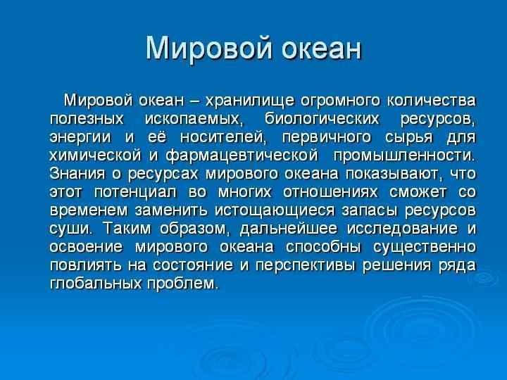 Самая ценная для человека часть Океана это ШЕЛЬФ – небольшая полоса затопленной суши вдоль берега материка. Шельф наиболее богат рыбой, морепродуктами и полезными ископаемыми.