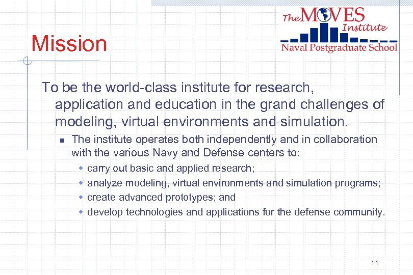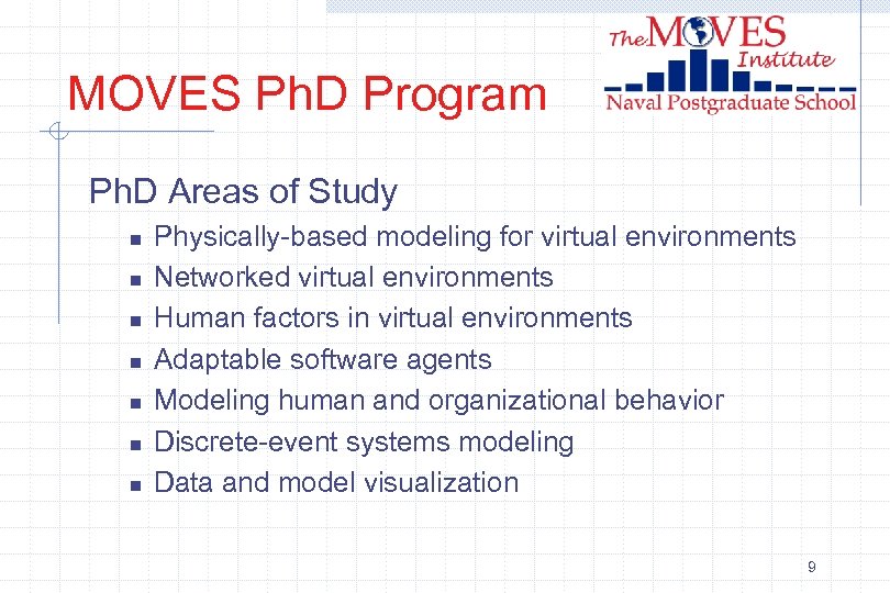 MOVES Ph. D Program Ph. D Areas of Study n n n n Physically-based modeling for virtual environments Networked virtual environments Human factors in virtual environments Adaptable software agents Modeling human and organizational behavior Discrete-event systems modeling Data and model visualization 9