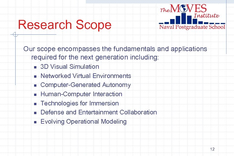 Mission To be the world-class institute for research, application and education in the grand challenges of modeling, virtual environments and simulation. n The institute operates both independently and in collaboration with the various Navy and Defense centers to: w w carry out basic and applied research; analyze modeling, virtual environments and simulation programs; create advanced prototypes; and develop technologies and applications for the defense community. 11