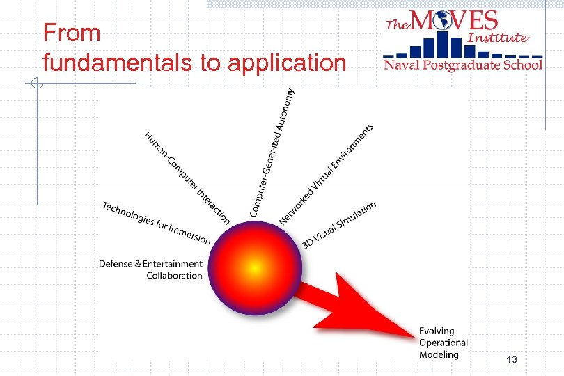 Research Scope Our scope encompasses the fundamentals and applications required for the next generation including: n n n n 3 D Visual Simulation Networked Virtual Environments Computer-Generated Autonomy Human-Computer Interaction Technologies for Immersion Defense and Entertainment Collaboration Evolving Operational Modeling 12
