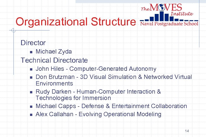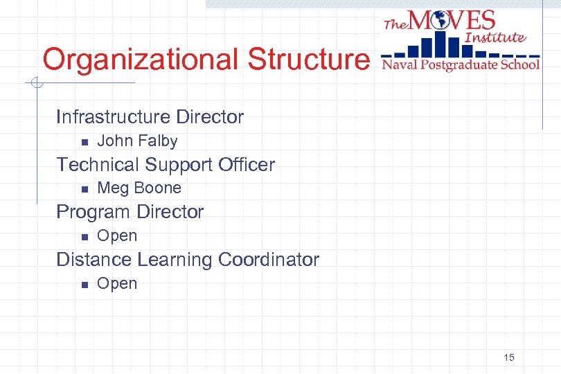Organizational Structure Director n Michael Zyda Technical Directorate n n n John Hiles - Computer-Generated Autonomy Don Brutzman - 3 D Visual Simulation & Networked Virtual Environments Rudy Darken - Human-Computer Interaction & Technologies for Immersion Michael Capps - Defense & Entertainment Collaboration Alex Callahan - Evolving Operational Modeling 14