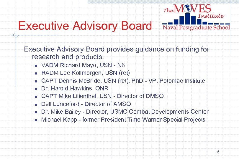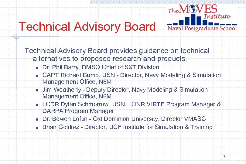 Executive Advisory Board provides guidance on funding for research and products. n n n n VADM Richard Mayo, USN - N 6 RADM Lee Kollmorgen, USN (ret) CAPT Dennis Mc. Bride, USN (ret), Ph. D - VP, Potomac Institute Dr. Harold Hawkins, ONR CAPT Mike Lilienthal, USN - Director of DMSO Dell Lunceford - Director of AMSO Dr. Mike Bailey - Director, USMC Combat Developments Center Michael Kapp - former President Time Warner Special Projects 16