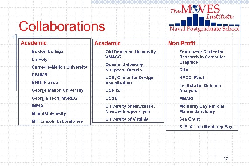 Collaborations Academic Boston College Cal. Poly Carnegie-Mellon University CSUMB Academic Old Dominion University, VMASC Queens University, Kingston, Ontario Non-Profit Fraunhofer Center for Research in Computer Graphics CNA ENIT, France UCB, Center for Design Visualization George Mason University UCF IST Institute for Defense Analysis Georgia Tech, MSREC UCSC MBARI INRIA University of Newcastle, Newcastle-upon-Tyne Monterey Bay National Marine Sanctuary University of Virginia Sea Grant Miami University MIT Lincoln Laboratories HPCC, Maui S. E. A. Lab Monterey Bay 18
