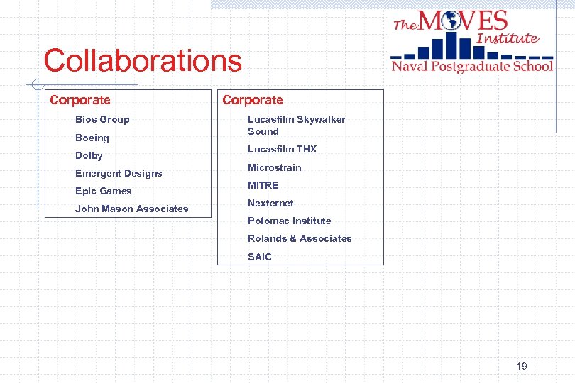 Collaborations Corporate Bios Group Boeing Dolby Emergent Designs Epic Games John Mason Associates Corporate Lucasfilm Skywalker Sound Lucasfilm THX Microstrain MITRE Nexternet Potomac Institute Rolands & Associates SAIC 19