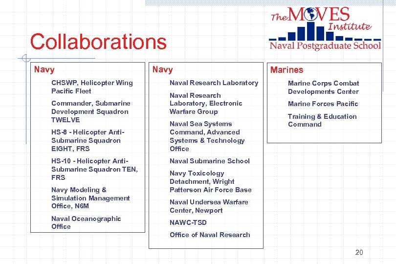 Collaborations Navy CHSWP, Helicopter Wing Pacific Fleet Commander, Submarine Development Squadron TWELVE HS-8 - Helicopter Anti. Submarine Squadron EIGHT, FRS HS-10 - Helicopter Anti. Submarine Squadron TEN, FRS Navy Modeling & Simulation Management Office, N 6 M Naval Oceanographic Office Navy Naval Research Laboratory, Electronic Warfare Group Naval Sea Systems Command, Advanced Systems & Technology Office Marines Marine Corps Combat Developments Center Marine Forces Pacific Training & Education Command Naval Submarine School Navy Toxicology Detachment, Wright Patterson Air Force Base Naval Undersea Warfare Center, Newport NAWC-TSD Office of Naval Research 20