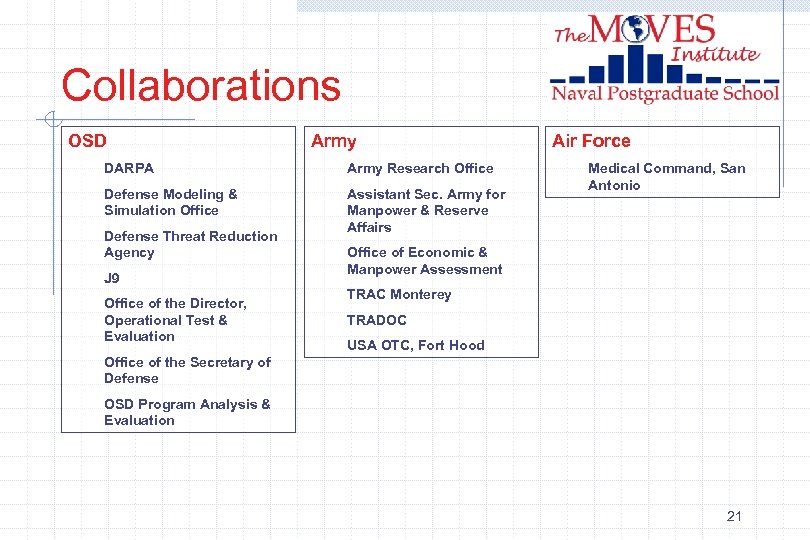 Collaborations OSD Army DARPA Army Research Office Defense Modeling & Simulation Office Assistant Sec. Army for Manpower & Reserve Affairs Defense Threat Reduction Agency J 9 Office of the Director, Operational Test & Evaluation Air Force Medical Command, San Antonio Office of Economic & Manpower Assessment TRAC Monterey TRADOC USA OTC, Fort Hood Office of the Secretary of Defense OSD Program Analysis & Evaluation 21