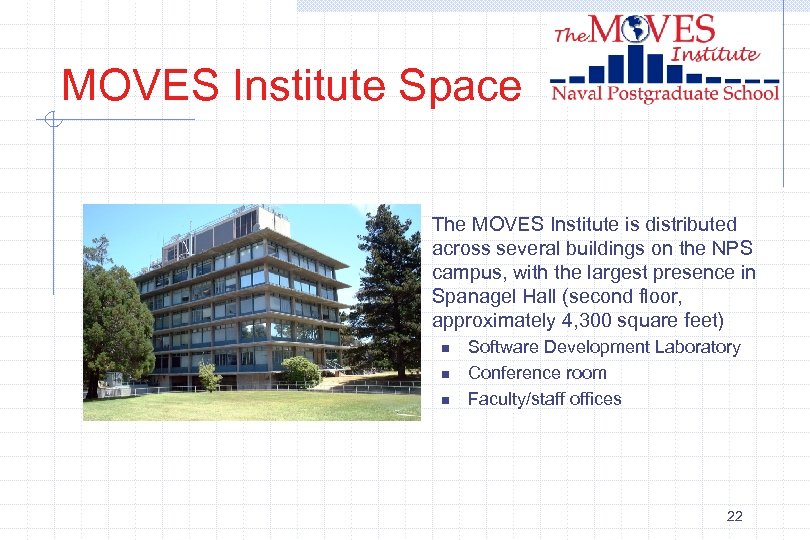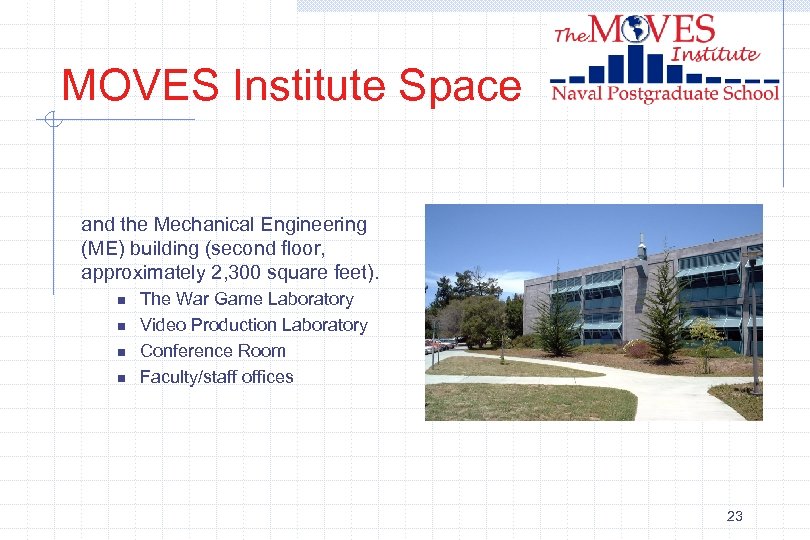 MOVES Institute Space The MOVES Institute is distributed across several buildings on the NPS campus, with the largest presence in Spanagel Hall (second floor, approximately 4, 300 square feet) n n n Software Development Laboratory Conference room Faculty/staff offices 22