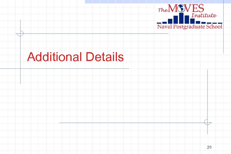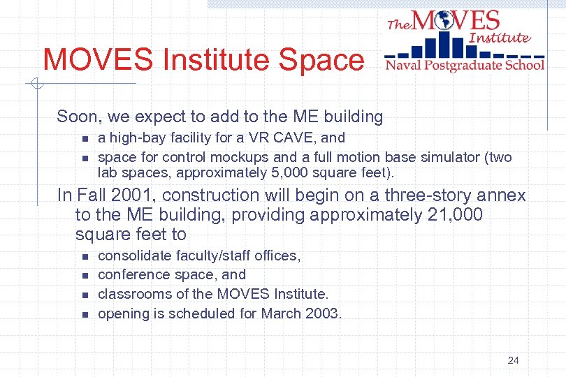 MOVES Institute Space Soon, we expect to add to the ME building n n a high-bay facility for a VR CAVE, and space for control mockups and a full motion base simulator (two lab spaces, approximately 5, 000 square feet). In Fall 2001, construction will begin on a three-story annex to the ME building, providing approximately 21, 000 square feet to n n consolidate faculty/staff offices, conference space, and classrooms of the MOVES Institute. opening is scheduled for March 2003. 24