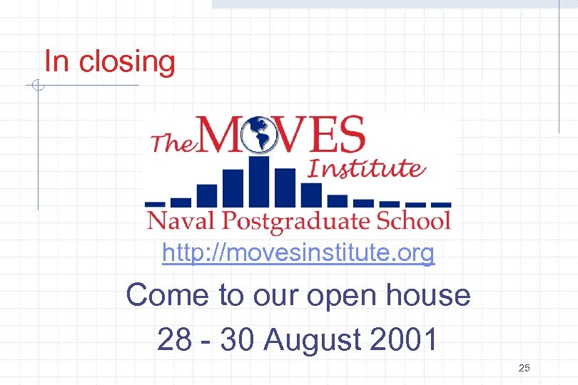 In closing http: //movesinstitute. org Come to our open house 28 - 30 August 2001 25