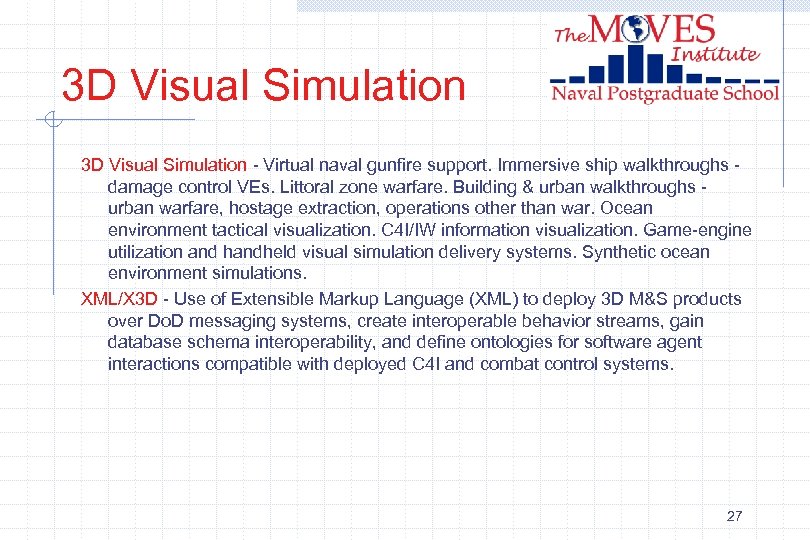 3 D Visual Simulation - Virtual naval gunfire support. Immersive ship walkthroughs damage control VEs. Littoral zone warfare. Building & urban walkthroughs urban warfare, hostage extraction, operations other than war. Ocean environment tactical visualization. C 4 I/IW information visualization. Game-engine utilization and handheld visual simulation delivery systems. Synthetic ocean environment simulations. XML/X 3 D - Use of Extensible Markup Language (XML) to deploy 3 D M&S products over Do. D messaging systems, create interoperable behavior streams, gain database schema interoperability, and define ontologies for software agent interactions compatible with deployed C 4 I and combat control systems. 27