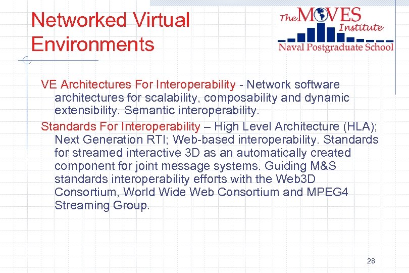 Networked Virtual Environments VE Architectures For Interoperability - Network software architectures for scalability, composability and dynamic extensibility. Semantic interoperability. Standards For Interoperability – High Level Architecture (HLA); Next Generation RTI; Web-based interoperability. Standards for streamed interactive 3 D as an automatically created component for joint message systems. Guiding M&S standards interoperability efforts with the Web 3 D Consortium, World Wide Web Consortium and MPEG 4 Streaming Group. 28