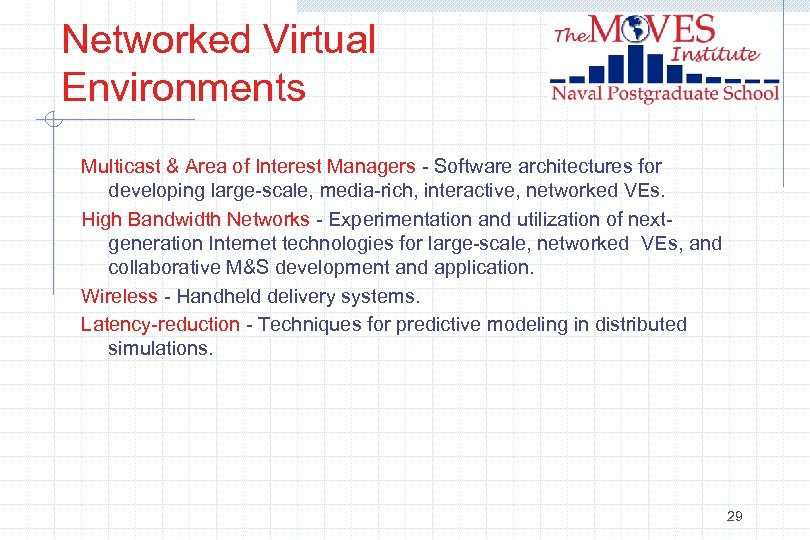 Networked Virtual Environments Multicast & Area of Interest Managers - Software architectures for developing large-scale, media-rich, interactive, networked VEs. High Bandwidth Networks - Experimentation and utilization of nextgeneration Internet technologies for large-scale, networked VEs, and collaborative M&S development and application. Wireless - Handheld delivery systems. Latency-reduction - Techniques for predictive modeling in distributed simulations. 29