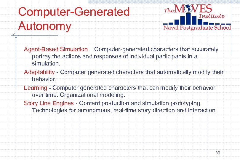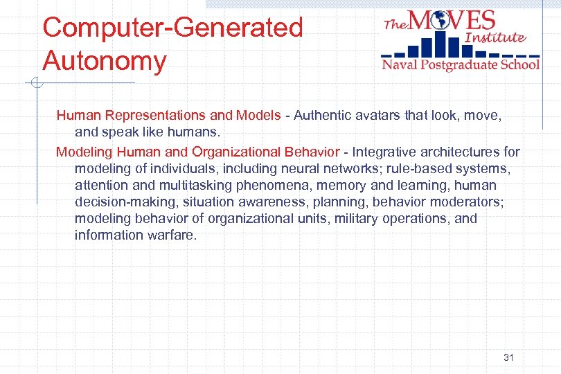 Computer-Generated Autonomy Agent-Based Simulation – Computer-generated characters that accurately portray the actions and responses of individual participants in a simulation. Adaptability - Computer generated characters that automatically modify their behavior. Learning - Computer generated characters that can modify their behavior over time. Organizational modeling. Story Line Engines - Content production and simulation prototyping. Technologies for autonomous, real-time story direction and interaction. 30