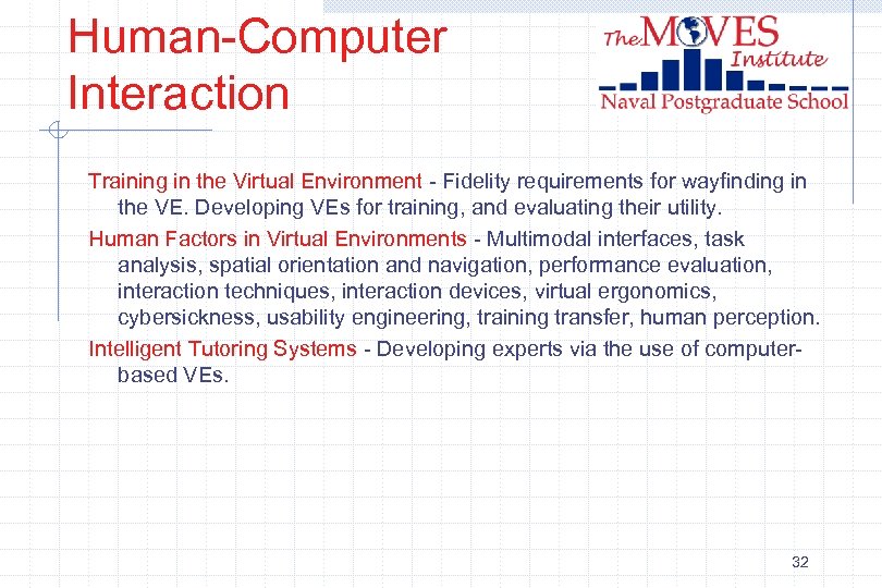 Human-Computer Interaction Training in the Virtual Environment - Fidelity requirements for wayfinding in the VE. Developing VEs for training, and evaluating their utility. Human Factors in Virtual Environments - Multimodal interfaces, task analysis, spatial orientation and navigation, performance evaluation, interaction techniques, interaction devices, virtual ergonomics, cybersickness, usability engineering, training transfer, human perception. Intelligent Tutoring Systems - Developing experts via the use of computerbased VEs. 32