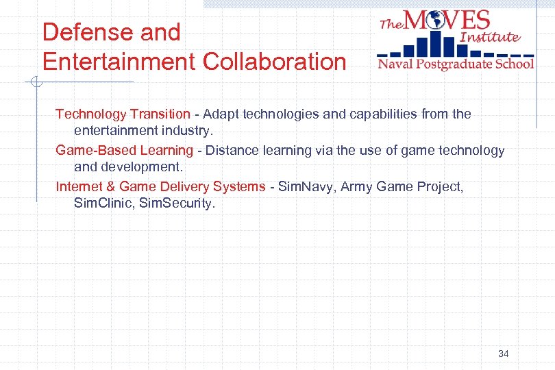 Defense and Entertainment Collaboration Technology Transition - Adapt technologies and capabilities from the entertainment industry. Game-Based Learning - Distance learning via the use of game technology and development. Internet & Game Delivery Systems - Sim. Navy, Army Game Project, Sim. Clinic, Sim. Security. 34