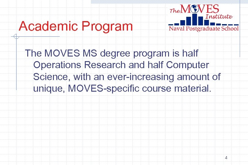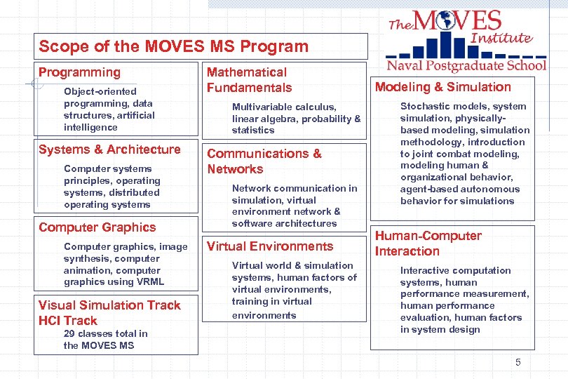 Academic Program The MOVES MS degree program is half Operations Research and half Computer Science, with an ever-increasing amount of unique, MOVES-specific course material. 4
