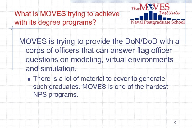 What is MOVES trying to achieve with its degree programs? MOVES is trying to provide the Do. N/Do. D with a corps of officers that can answer flag officer questions on modeling, virtual environments and simulation. n There is a lot of material to cover to generate such graduates. MOVES is one of the hardest NPS programs. 6