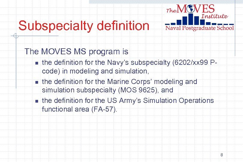 Subspecialty definition The MOVES MS program is n n n the definition for the Navy’s subspecialty (6202/xx 99 Pcode) in modeling and simulation, the definition for the Marine Corps’ modeling and simulation subspecialty (MOS 9625), and the definition for the US Army’s Simulation Operations functional area (FA-57). 8