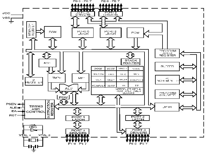 Block Diagram External interrupts Interrupt Control On-chip ROM for program code Timer/Counter On-chip RAM Timer 1 Timer 0 CPU OSC Bus Control 4 I/O Ports P 0 P 1 P 2 P 3 Address/Data Serial Port Tx. D Rx. D Counter Inputs