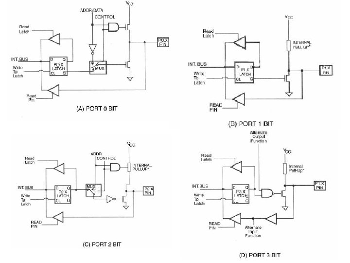 Port Structures • • • The 8051 contains four I/O ports All four ports are bidirectional Each port has SFR (Special Function Registers P 0 through P 3) which works like a latch, an output driver and an input buffer Both output driver and input buffer of Port 0 and output driver of Port 2 are used for accessing external memory Accessing external memory works like this – Port 0 outputs the low byte of external memory address (which is time-multiplexed with the byte being written or read) – Port 2 outputs the high byte (only needed when the address is 16 bits wide) Port 3 pins are multifunctional. The alternate functions are activated with the 1 written in the corresponding bit in the port SFR