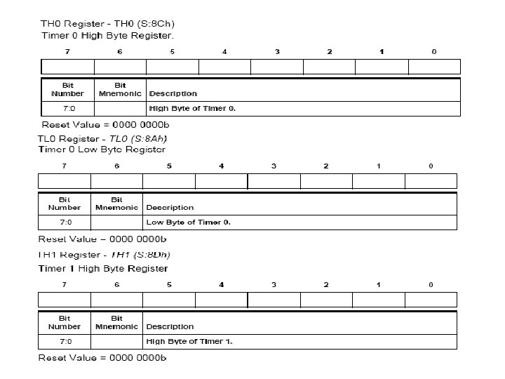 Timer/Counters • The 8051 has two 16 -bit Timer/Counter registers – Timer 0 – Timer 1 • Both can work either as timers or event counters • Both have four different operating modes from which to select. – – Mode 0 (13 -bit Timer) Mode 1 (16 -bit Timer) Mode 2 (8 -bit Timer with Auto-Reload) Mode 3 (Two 8 -bit Timers)