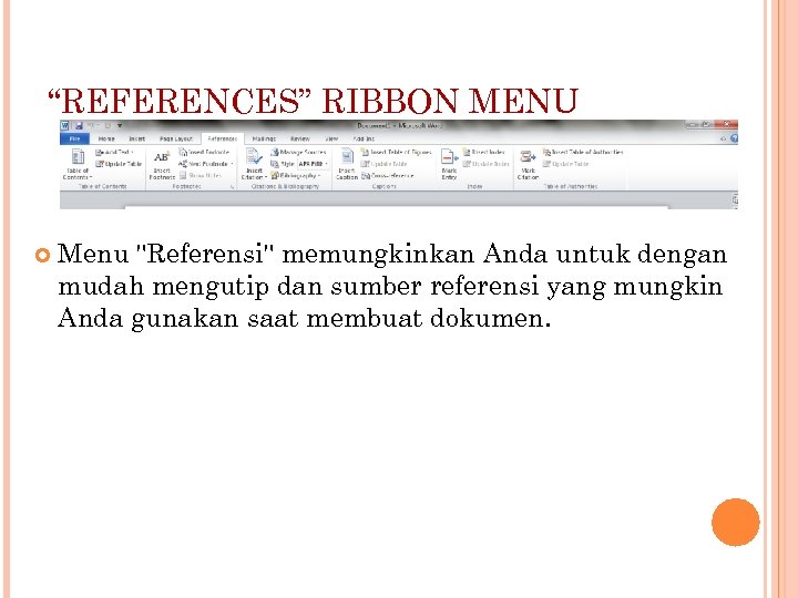 “REFERENCES” RIBBON MENU Menu "Referensi" memungkinkan Anda untuk dengan mudah mengutip dan sumber referensi yang mungkin Anda gunakan saat membuat dokumen.