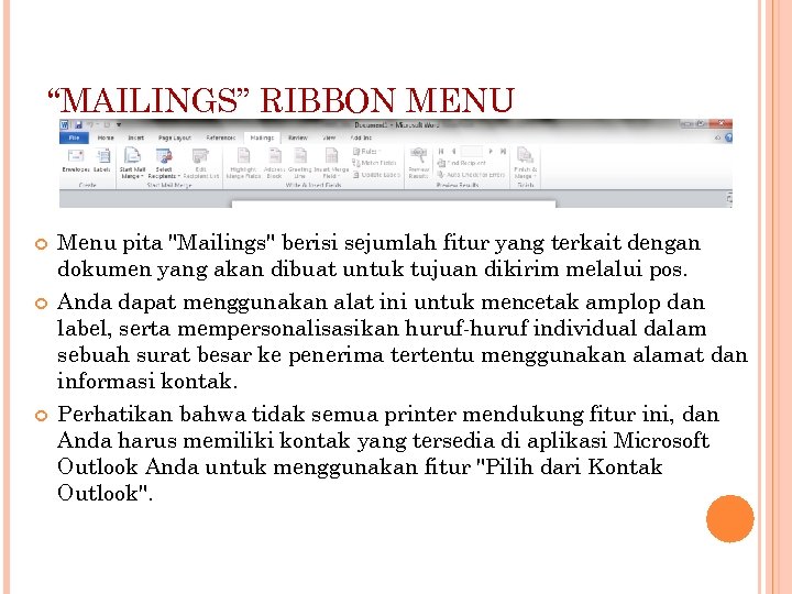 “MAILINGS” RIBBON MENU Menu pita "Mailings" berisi sejumlah fitur yang terkait dengan dokumen yang akan dibuat untuk tujuan dikirim melalui pos. Anda dapat menggunakan alat ini untuk mencetak amplop dan label, serta mempersonalisasikan huruf-huruf individual dalam sebuah surat besar ke penerima tertentu menggunakan alamat dan informasi kontak. Perhatikan bahwa tidak semua printer mendukung fitur ini, dan Anda harus memiliki kontak yang tersedia di aplikasi Microsoft Outlook Anda untuk menggunakan fitur "Pilih dari Kontak Outlook".