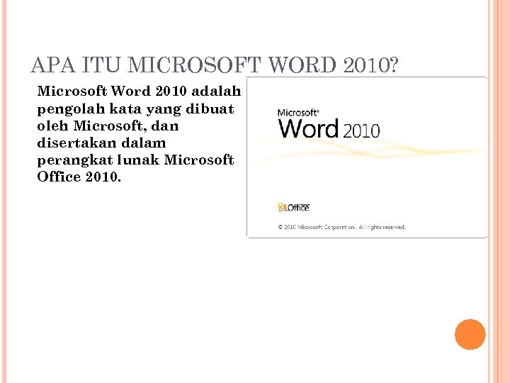 APA ITU MICROSOFT WORD 2010? Microsoft Word 2010 adalah pengolah kata yang dibuat oleh Microsoft, dan disertakan dalam perangkat lunak Microsoft Office 2010.