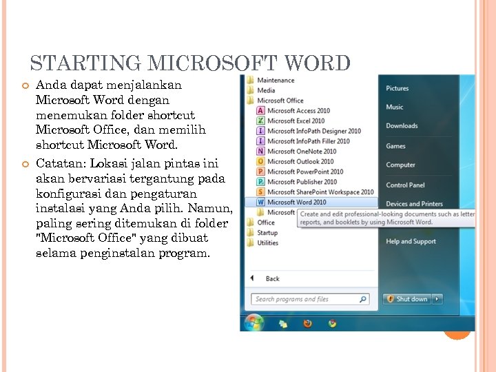 STARTING MICROSOFT WORD Anda dapat menjalankan Microsoft Word dengan menemukan folder shortcut Microsoft Office, dan memilih shortcut Microsoft Word. Catatan: Lokasi jalan pintas ini akan bervariasi tergantung pada konfigurasi dan pengaturan instalasi yang Anda pilih. Namun, paling sering ditemukan di folder "Microsoft Office" yang dibuat selama penginstalan program.