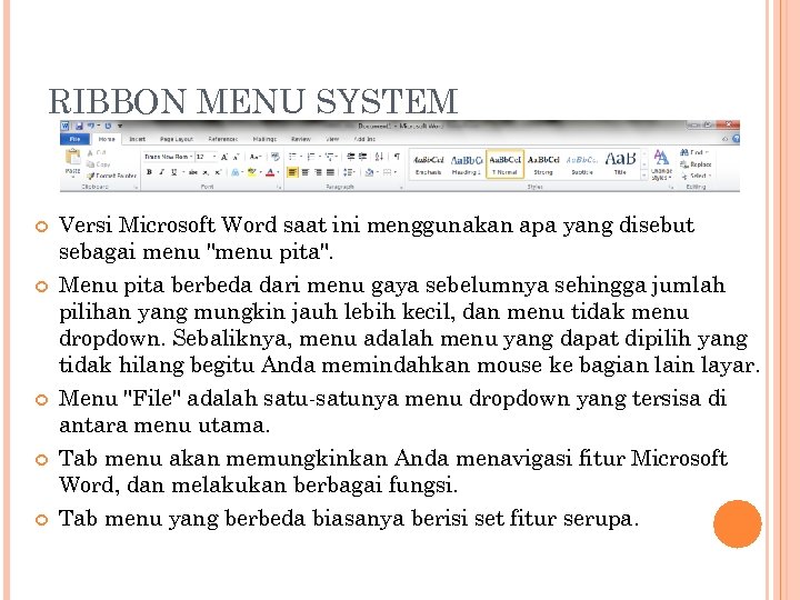 RIBBON MENU SYSTEM Versi Microsoft Word saat ini menggunakan apa yang disebut sebagai menu "menu pita". Menu pita berbeda dari menu gaya sebelumnya sehingga jumlah pilihan yang mungkin jauh lebih kecil, dan menu tidak menu dropdown. Sebaliknya, menu adalah menu yang dapat dipilih yang tidak hilang begitu Anda memindahkan mouse ke bagian lain layar. Menu "File" adalah satu-satunya menu dropdown yang tersisa di antara menu utama. Tab menu akan memungkinkan Anda menavigasi fitur Microsoft Word, dan melakukan berbagai fungsi. Tab menu yang berbeda biasanya berisi set fitur serupa.