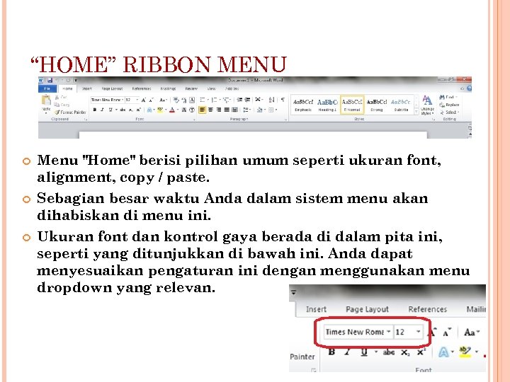 “HOME” RIBBON MENU Menu "Home" berisi pilihan umum seperti ukuran font, alignment, copy / paste. Sebagian besar waktu Anda dalam sistem menu akan dihabiskan di menu ini. Ukuran font dan kontrol gaya berada di dalam pita ini, seperti yang ditunjukkan di bawah ini. Anda dapat menyesuaikan pengaturan ini dengan menggunakan menu dropdown yang relevan.