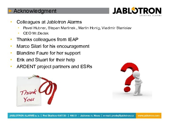 Acknowledgment • Colleagues at Jablotron Alarms • • Pavel Hubner, Stepan Martinek , Martin Honig, Vladimir Stanislav CEO Mr. Dedek Thanks colleagues from IEAP Marco Silari for his encouragement Blandine Faure for her support Erik and Stuart for their help ARDENT project partners and ESRs