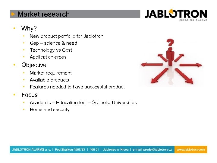 Market research • Why? • • New product portfolio for Jablotron Gap – science & need Technology vs Cost Application areas • Objective • • • Market requirement Available products Features needed to have successful product • Focus • • Academic – Education tool – Schools, Universities Homeland security