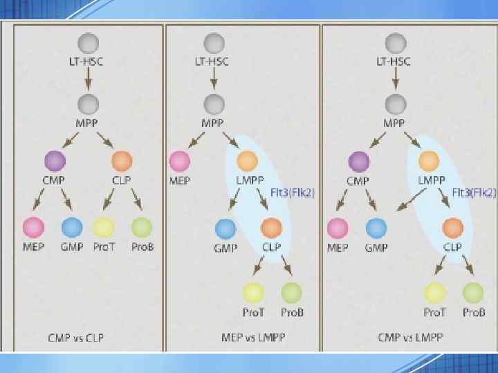 • Таким образом, по существующей на данный момент информации MPP проходят стадию CMP или LMPP прежде чем дать начало миелоидному и лимфоидному ростку • Для более точного разделения путей развития лимфоидных и миелоидных клеток необходимо привлекать дополнительные маркеры