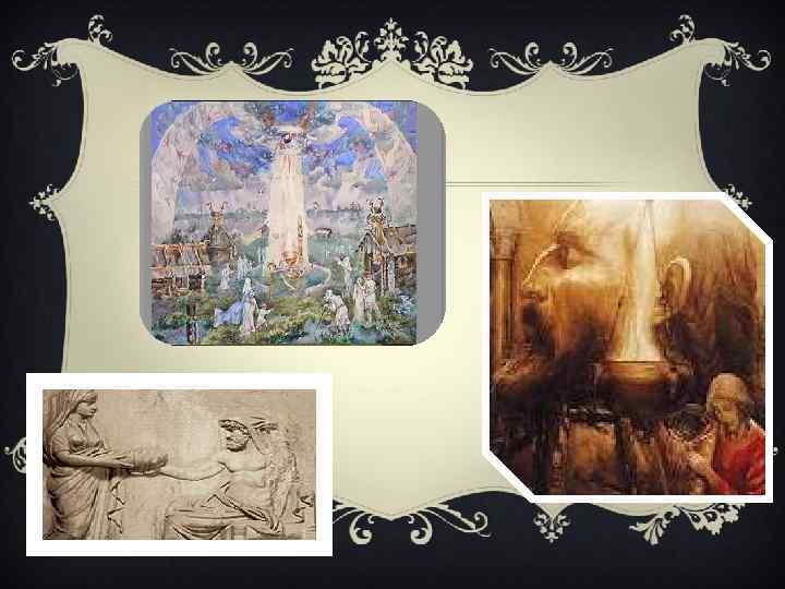 v Мифы –древние сказания разных народов о фантастических существах, о богах, о космосе. Мифы связаны с обрядами, обычаями, содержат нравственные нормы и эстетические представления, сочетание реальности и фантазии, мысли и чувства. В мифах человек не выделяет себя из природы.