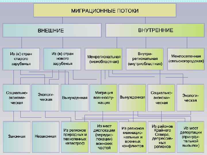 Внешние миграции связанны с переселением из одной страны в другую. Внутренние миграции происходят в пределах одной страны.