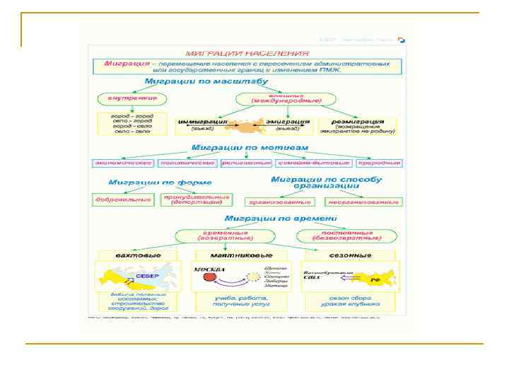n n Большое воздействие на численность, состав и размещение населения в отдельных странах и во всём мире оказывают его перемещения, называемые миграциями населения. Различают два основных вида миграции – это международные(внешние) миграции, возникшие глубоко в древности и связанные прежде всего с великими географическими открытиями, последующей колонизацией стран и развитием капиталистических отношений в обществе. Основная причина такого рода миграции - экономическая, когда люди уезжают в поисках нового места приложения труда, лучшей жизни. Такие миграции получили название трудовых миграций (нелегальные миграции). Второй вид миграции – это внутренние (внутригосударственные) миграции. К ним относятся: перемещение населения в города из сельской местности, которое во многих странах, включая Россию служит основным источником доходов. Миграция происходит так же между большими и малыми городами, это связано прежде всего с освоением новых земель. Этот вид миграции характерен прежде всего для больших по территории стран – России, Казахстана, Канады, Бразилии, Австралии и т. д.