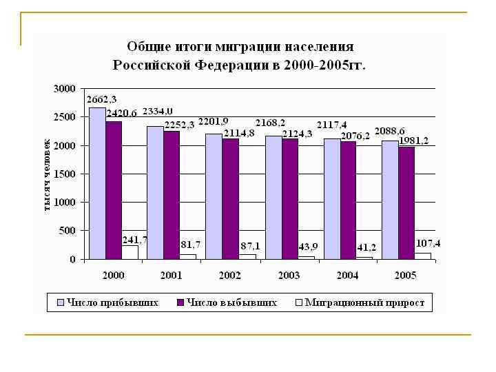 n n В подведении итогов, миграция – это сложный процесс перемещения общественных масс, связанный прежде всего с социальноэкономическим фактором. Сегодня большинство экономистов-экспертов убеждены, что запланированный на ближайшую перспективу экономический рост, даже при реальном повышении производственного труда, невозможен без масштабного пополнения трудовых ресурсов за счёт миграции. Таким образом, процесс миграции глубочайшим образом охватывает социально–экономическую сферу жизни общества и влияет на её дальнейшее развитие.