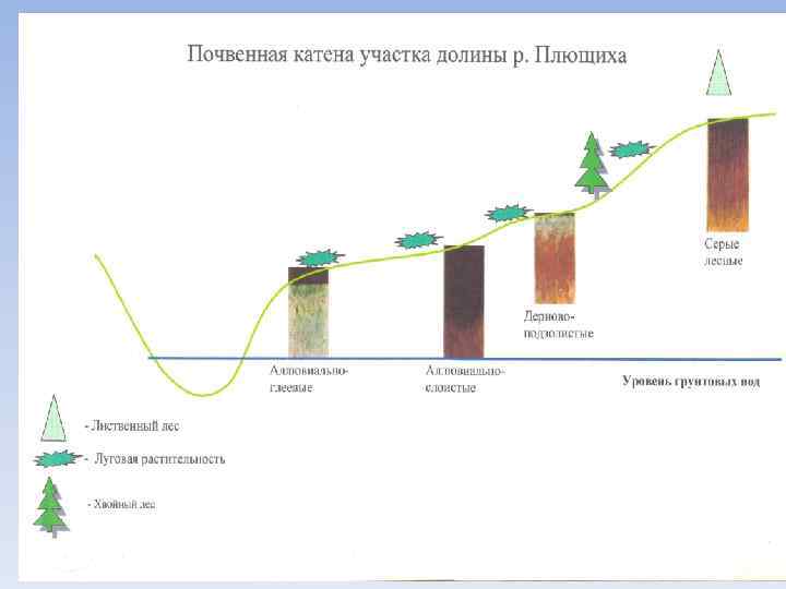 Стадийность формирования почвенного профиля 4. Стадия нормального профиля – имеется полный набор генетических горизонтов, характерный для данного типа почвообразования, при нормальной для данных ландшафтных условий мощности горизонтов (серые лесные почвы, черноземы, дерново-подзолистые и т. д. ). А А А 2 АВ В Вt ВС С С C