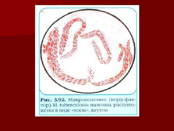 Патогенність n обумовлена структурними компонентами клітини n Cord-фактор (диміколат трегалози) - пригнічує міграцію лейкоцитів - антифагоцитарний фактор - місцева токсична дія Виявляють за допомогою методів Прайса та Школьнікової – мазки поміщають у цитратну кров, через 3 -4 доби скельця виймають, фарбують за Цілем-Нільсеном, виявляють мікроколонії у вигляді кіс або жгутів