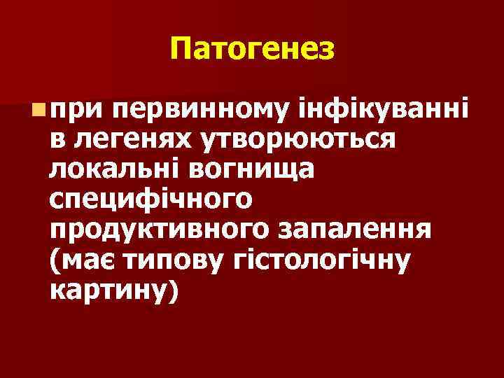 Патогенез n при первинному інфікуванні в легенях утворюються локальні вогнища специфічного продуктивного запалення (має типову гістологічну картину)