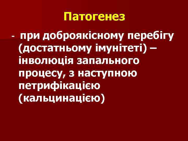 Патогенез - при доброякісному перебігу (достатньому імунітеті) – інволюція запального процесу, з наступною петрифікацією (кальцинацією)