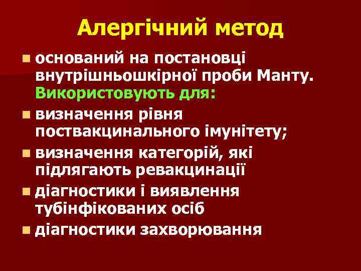 Алергічний метод n оснований на постановці внутрішньошкірної проби Манту. Використовують для: n визначення рівня поствакцинального імунітету; n визначення категорій, які підлягають ревакцинації n діагностики і виявлення тубінфікованих осіб n діагностики захворювання
